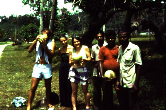 As we were walking along, we came to where some men were cutting down a coconut palm. The way it was leaning over a house and they were cutting on the same side, I was sure it would come down on the house. We had to stay and watch the operation. Before it got cut enough to fall, ropes were attached to the tree and men pulled from away from the house, but parallel to it. The final cuts were done, the tree fell at an angle missing the house. The men opened up one of the coconuts and we enjoyed the drink.
