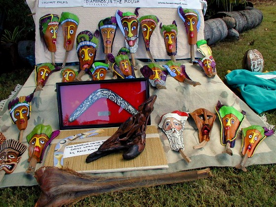 Tashi's 911 Art Show meant that I had to make a display for my Polihale Palm Frond Faces. I had a bunch of ideas that required a lot of work. I decided on something like this with a sign or two at the top: