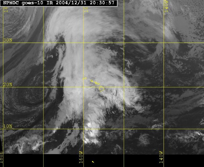The Indian Ocean Tsunami disaster and suffering by so many has cast gloom over the year's end and beginning of the New Year. Even the heavens above Kaua'i and all the Hawaiian Islands are crying. There has been rain, rain, rain and dark skies that seem to be reflecting my mood. I made a copy of the Big Blue Satellite picture of the Pacific this morning which shows the huge mass of storm clouds hiding the Hawaiian Islands: