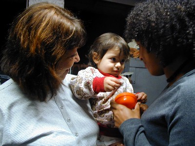 Linda holding Haily then cooking some of the ahi firecrackers.