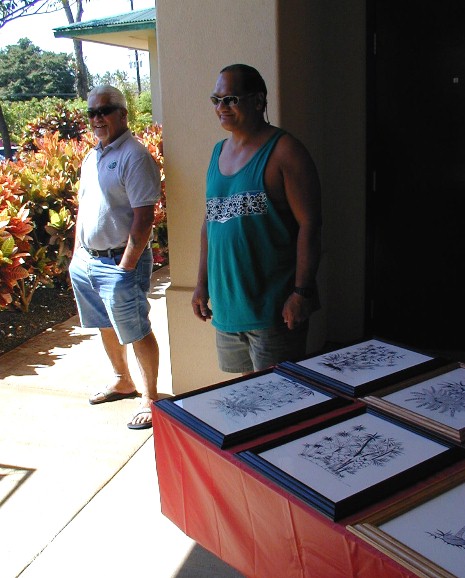 Clifford Apo (on the right) and his art. You've seen him at Polihale.