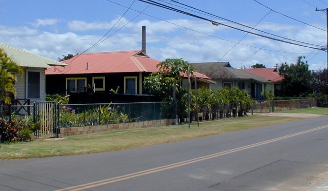Elepaio Road bus stop. The house that has the Kekaha Sugar Mill smoke stack in distance is behind 15B.