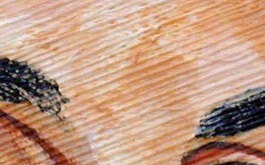 When painting with acrylics, (these comments are from my own observations, I have never had an "art course" nor done any research on techniques of acrylic painting) thin layers of colored plastic are laid down on plastic and its final effect on the color in the painting will be influenced by the color of plastic beneath it. The harsh darker colors around the eyes will be lightened and softened by following layers. And look at that darker part above the nose. Here's a closer look: