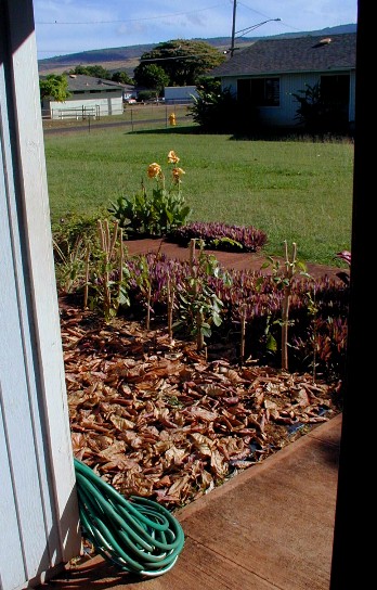 Change of subject: Last month, I found out that trees and plants must be at least three feet from the foundation of the building. I had to move my panax trees. I decided to make a little alcove which will be in the shade most of the time. I do not want to fight weeds, so I decided to put down black plastic in the 3-foot zone and in my alcove. Tashi's False Kamani tree produces a lot of leaves that are not moved much by the wind. I decided to cover the alcove and zone's plastic with some of those leaves. Later on, I have a plan with old palm fronds for the alcove.