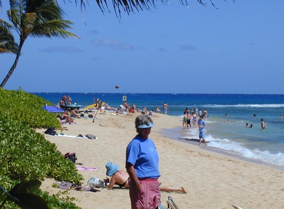 I'm in the process of doing a big stored stuff cleanup...taking photos of what I want to remember before throwing most away...so I've taken a break from painting and working on this website. Going through about everything I have stored in boxes and unfinished art projects and materials will take weeks and I want to get it completed before I travel. Last week, I went to Lihue then to Dallas and Gilbert's house/farm. We went to the Waiohai Resort's beach in Po'ipu for a swim. I was surprised at how crowded it was on a Thursday. Many of the people on the beach and by the pools will spend most of their vacations here and miss most of what Kaua'i has to offer visitors. Lucky I live Kaua'i. The lighting wasn't very good for snapshots, but here are a few: