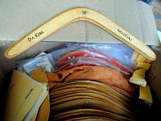 I throught that I would be throwing most of what is in that box away after I took photos. I had already photographed one of the boomerang boxes, just from the outside. I have now looked at only four of the boomerangs and many possibilities, that I had thought about in the past, popped into my head. Things that I could do, now, on the Internet with this website. Here's are three shots of the boomerang box with an early Aloha Rang, a Rainbow Rang and below it an Artrang with one of Lorilyn's Dreamscapes silk-screened onto a boomerang (I'll talk about these in a future Artmail), and an Artrang started by me on a boomerang that I had hand-shaped: