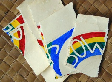 The first "art" of mine that I tore up and threw away in this project was the logo design I drew for the Rainbow Rang trademark that never happened (long story). Now, there are just photos to remember it by: