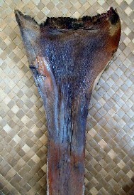 One of the projects that I have going is painting a palm frond mask for a local businessman. It happened at the Waimea Lighted Christmas Parade...A voice called out, "Hey, Boomerang Art." I looked and there was a friend holding up an old palm frond base that he must have seen nearby and picked up. He wanted me to paint one of my faces like the couple that he has already. It wasn't a very good looking palm frond and I have other projects. I had put painting palm frond faces on hold for now. But, he insisted and insisted, so I took the frond base and put it in my car. When I got home, I cut off ugly fibers and scrubbed it, then set it aside.