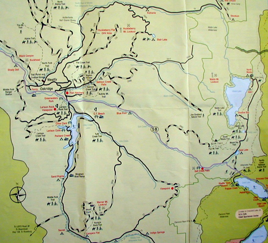 We continued driving north on I-5 then turned off the highway before Eugene. We we headed to highway 58 and to Oakridge-Westfir, The Center of Oregon Recreation. What Kim likes about this area is the readily accessible beauty via trails through forests. I the Applegate area, most of the land is private, therefore not readily accessible to hikers.