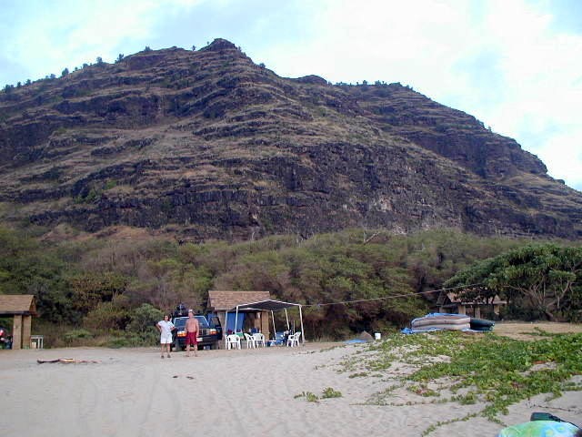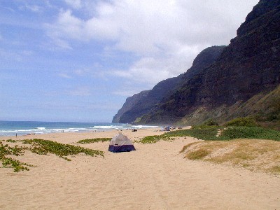 May 27th of the Memorial Day Weekend at Polihale...TTashi and I took a ride out to Polihale. I needed some Polihale sand for my wedding present and I wanted to check out the graded cane road. The road to Polihale is the smoothest it's been for a long time. The cane road and the park roads had been graded all the way to the farthest-in pavilion. I was able to even drive the Tercel to it...