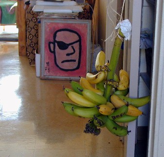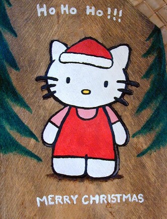 Happy Holidays everyone. It's been a busy time for me and the project I've given myself of scanning my old slides and photos is a slow process. The old slides from past travels have varying kinds of deterioration, dust, etc. which appear in the scanned images. It takes a lot of time to cut little pieces of clear sky to paste over the worst dark spots and lines which distract greatly from the "picture" before posting in last month's Artmails. I've also been doing some painting with acrylics on cocopalm fiber. My grandaughter loves "Hello Kitty" so I painted her with a Santa cap as seen above. The Hello Kitty is able to be separated from the background fiber. I enjoy little projects like that and learn from them as well.