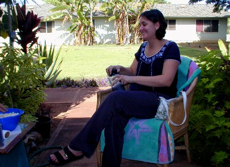 We talked story and ate some healthy fruit that Dave prepared for us. I made some popcorn. One of his students, who lives in Kekaha Ha'aheo, was surprised to see her teacher sitting at Boomerang Art's. She joined the group, but didn't want her photo taken.