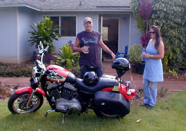 Walter, Erica and I had been friends for several years already...campers at Polihale. Walter and I played many games of backgammon. I played some with Erica, too. Erica is now married and has a baby and living on the Eastside. Anyway, here are two photos of Walter and his girlfriend, Coquette, and his present Harley. They stopped by one day so I could meet Coquette and talk story.