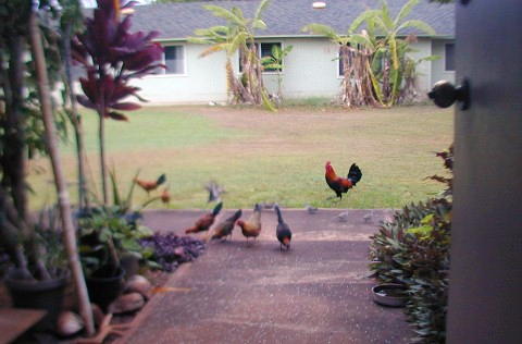 Most of he photos I have taken this month were of the zebra doves that know 15B's front yard is a feeding and watering place. The zebra doves hang out and keep an eye on me and my car. (Now, I drive the Tercel to Waimea for supplies). The doves have a characteristic pattern of eating the rice that I scatter on the walk. First, the doves that stay close to 15B most of the time approach the food in "dynamic lines" because they trust me. Secondly, other doves "get the message" that there is safe food at 15B and start arriving from all directions, but form those "dynamic lines."