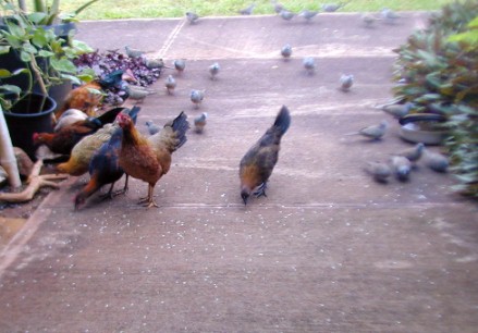 Discussion: For a later time...I'm still waiting for that brood to mature and leave The Orphan. That will probably be when she decides to hatch another brood. Will that "scattered-rice dove feeding" behavior be passed on by her first generation to other groups of chickens if she is not in the picture?