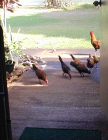 When I tossed out some rice, the little orphan chick would come running to the rice field. As The Orphan's size was as large as the doves and getting bigger every day. She would sleep by her mother's decomposing body and scratch for food among the roots of the big monkey-pod tree, but would come running at rice time. Other chickens were few and far between because of one of my neighbor's dislike of roosters crowing. The Orphan did not associate with the occasional groups (clutches) of chickens that would come by 15B...she would make herself scarce.