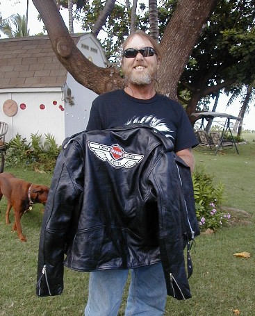 Polihale Wally stopped by Tashi's while I was online. Check out his Harley and his 100 year anniversary jacket.