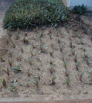 Tashi found the name of the plant. It's the Boat Lily or Moses-in-the-Boat (Rhoeo spathacea). It's a native of Central America. The small, white flowers are in boat-shaped bracts below the leaves. It is not a true lily...it's in the Dayflower Family. I will be taking progress photos as the ground cover develops.