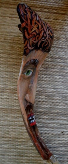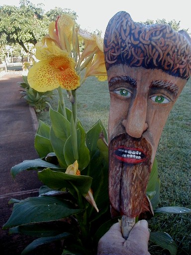 When I decided to do the Purple Feather People project, these palm frond bases would be numbers 1 through 12. The original No. 1 is becoming The Impostor, now Kanaloa is No. 1. Anyway, after I had been painting on most of these 12, I went to the Double Burner Pavilion to find some more palm fronds. There were none left. The ones that I expected to get were burned and ruined. I searched around to see if I could find any palm frond bases that might work. The one below is the only one I found. It was even rejected for burning. Is there a face in there? I decided that this one will become Number 13: