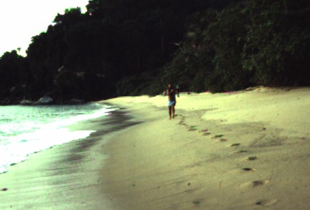 One night we were on this beach, watching orangish light flashing across the strait in the clouds. We decided that maybe a volcano was going off on Samatra. We were wrong.