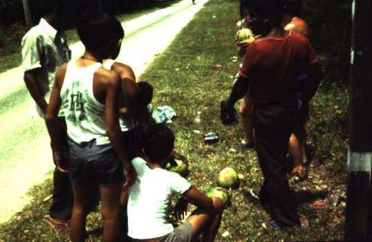 As we were walking along, we came to where some men were cutting down a coconut palm. The way it was leaning over a house and they were cutting on the same side, I was sure it would come down on the house. We had to stay and watch the operation. Before it got cut enough to fall, ropes were attached to the tree and men pulled from away from the house, but parallel to it. The final cuts were done, the tree fell at an angle missing the house. The men opened up one of the coconuts and we enjoyed the drink.