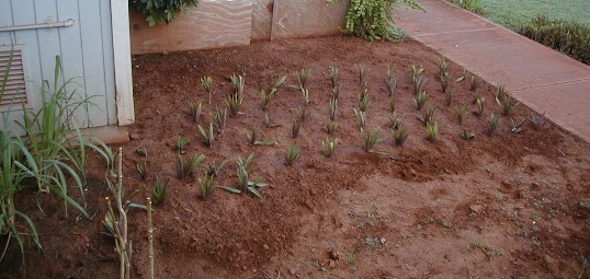 Between the oysterplant patches and the building, I have to leave space to have two meters to be accessed and read as well as space for my garbage can. Except for the mosquito plants, green onions and ti plant, the rest of the ground cover is volunteers and weeds. Take a look at the battle looming between the spider plant volunteer and the mosquito plant: