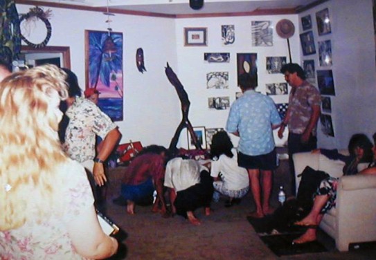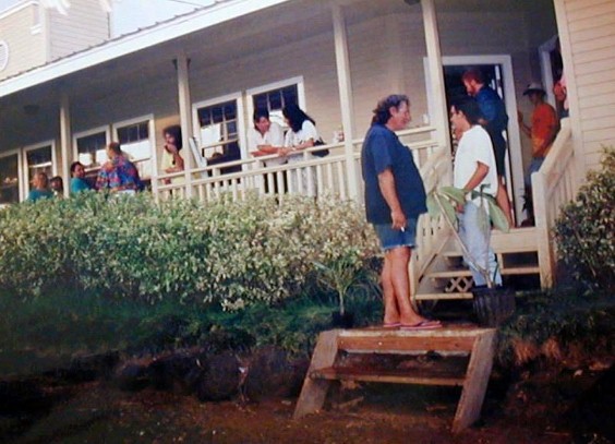 Tumu Nu. Walter, Clifford, Jude, and Erica. My tent is in back...I made the wall for the platform. The rocks were piled in this area when they were bulldozed out of what was to become a sugar cane field across the road. That's why the cane road went around the area of rocks. It was a junk place within the cane company lease of Hawaiian Homes land, adjacent to, but outside of Polihale State Park. I started Tumu Nu on October 7, 1992. Yes, there's a story.