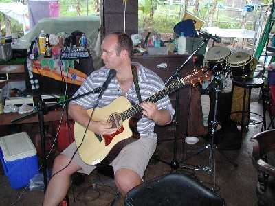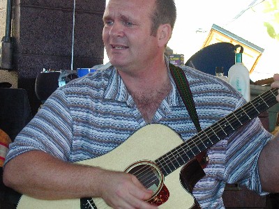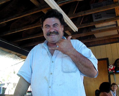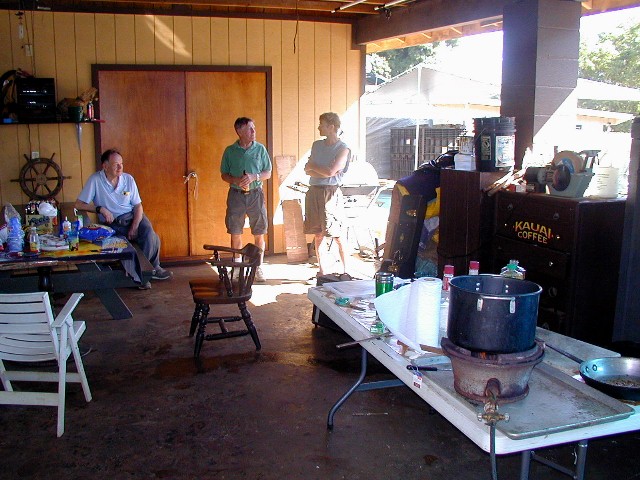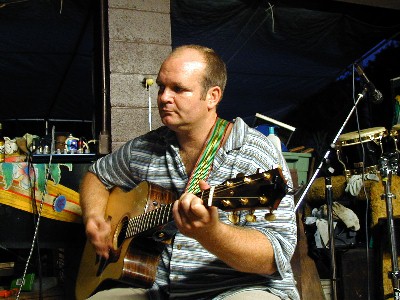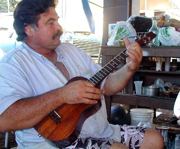 On the 2nd, Dr. Rick, the new Orthopedic Surgeon at KVMH (Kauai Veterns Memorial Hospital) in Waimea,and his lady, Janet, stopped by so they could follow Greg driving Steve and me toClifford's house for a garage party. He plays fine guitar and sings. He and Janet are from New York. They had been traveling in Australia and happened to stay at Doug's Rainbow Retreat in Nimbin, New South Wales. Doug showed them this website. Here's when I first met him (far down on the Artmail 119 page) at Tashi's Art Show (Janet hadn't arrived on Kaua'i, yet).