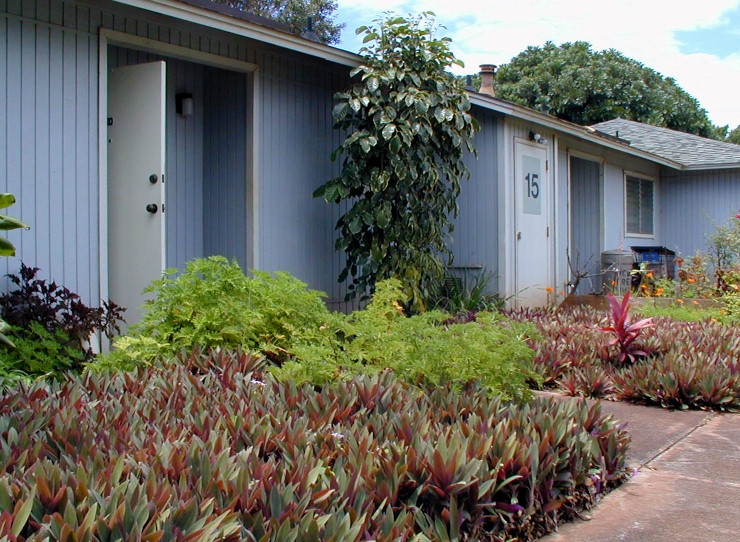Elepaio Road bus stop. The house that has the Kekaha Sugar Mill smoke stack in distance is behind 15B.
