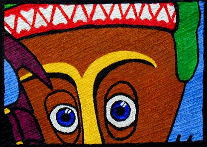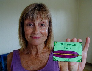 Greenbacks No. 1 through 20 will comprise one series, the Ohana Series. When it is completed, I will have a drawing for the winner of a Purple Feather Person palm frond face. This is my own thing for friends and family...Ohana. Here is a shot of Betsi with her birthday Greenback: