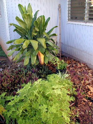 Change of subject: Last month, I found out that trees and plants must be at least three feet from the foundation of the building. I had to move my panax trees. I decided to make a little alcove which will be in the shade most of the time. I do not want to fight weeds, so I decided to put down black plastic in the 3-foot zone and in my alcove. Tashi's False Kamani tree produces a lot of leaves that are not moved much by the wind. I decided to cover the alcove and zone's plastic with some of those leaves. Later on, I have a plan with old palm fronds for the alcove.