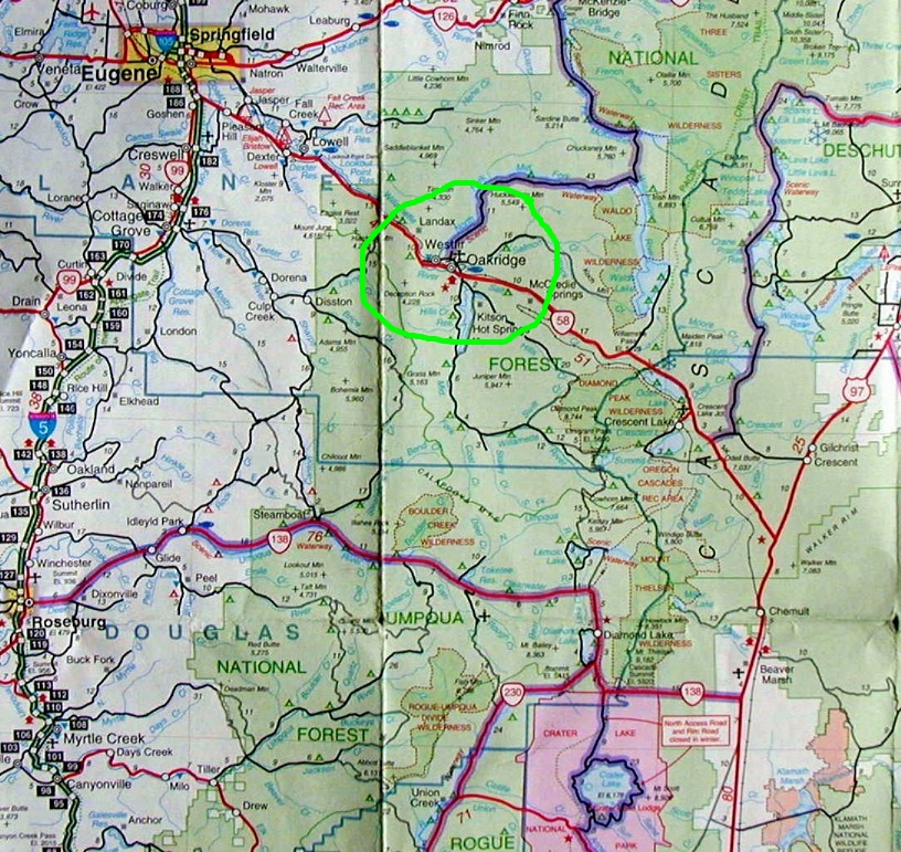 We continued driving north on I-5 then turned off the highway before Eugene. We we headed to highway 58 and to Oakridge-Westfir, The Center of Oregon Recreation. What Kim likes about this area is the readily accessible beauty via trails through forests. I the Applegate area, most of the land is private, therefore not readily accessible to hikers.