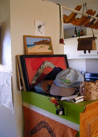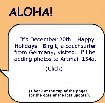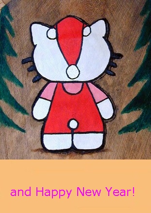Happy Holidays everyone. It's been a busy time for me and the project I've given myself of scanning my old slides and photos is a slow process. The old slides from past travels have varying kinds of deterioration, dust, etc. which appear in the scanned images. It takes a lot of time to cut little pieces of clear sky to paste over the worst dark spots and lines which distract greatly from the "picture" before posting in last month's Artmails. I've also been doing some painting with acrylics on cocopalm fiber. My grandaughter loves "Hello Kitty" so I painted her with a Santa cap as seen above. The Hello Kitty is able to be separated from the background fiber. I enjoy little projects like that and learn from them as well.