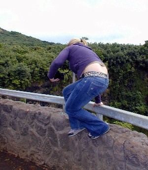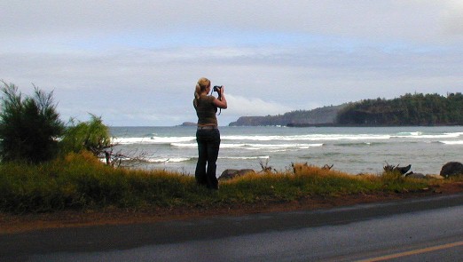When we got to the end of the road, after two or three rounds of looking for a parking space, Birgit got out of the car to check things out while I waited in the car in a non-parking place. Then we headed back. Next stop, the Hanalei Valley Lookout...