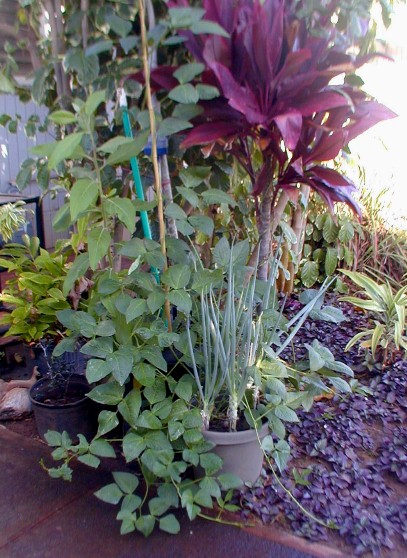 The beans in the onion container grew and eventually climbed the red ti plant stalk next to it and a bamboo stick that I stuck in a neighbor container...