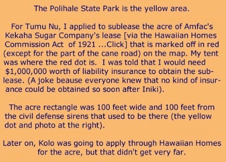 The idea for my developing project goes back to Tumu Nu days at Polihale after Hurricane Iniki which happened on 9/11/1992. I had gotten a "camping in a closed State Park" citation from Game Warden Perkins on October 7th.