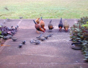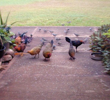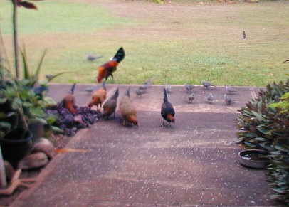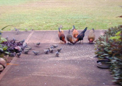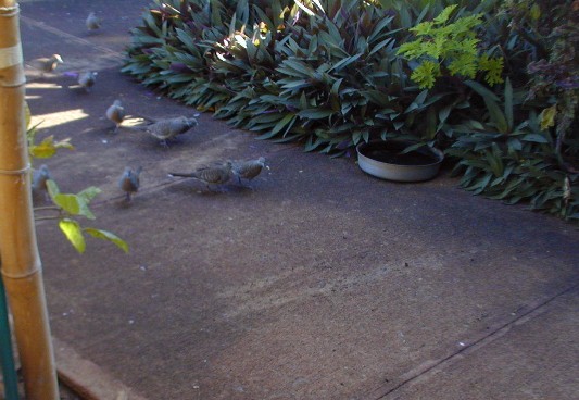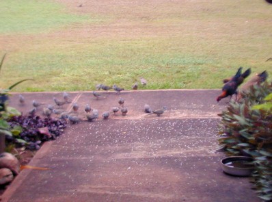 Most of he photos I have taken this month were of the zebra doves that know 15B's front yard is a feeding and watering place. The zebra doves hang out and keep an eye on me and my car. (Now, I drive the Tercel to Waimea for supplies). The doves have a characteristic pattern of eating the rice that I scatter on the walk. First, the doves that stay close to 15B most of the time approach the food in "dynamic lines" because they trust me. Secondly, other doves "get the message" that there is safe food at 15B and start arriving from all directions, but form those "dynamic lines."
