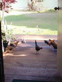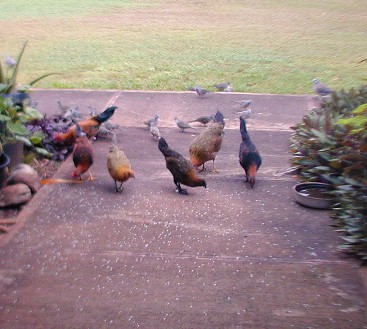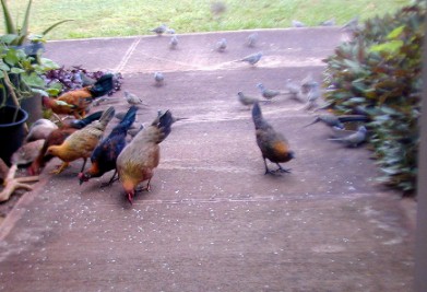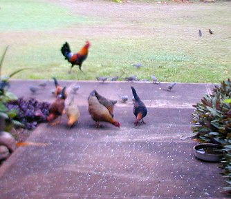 When I tossed out some rice, the little orphan chick would come running to the rice field. As The Orphan's size was as large as the doves and getting bigger every day. She would sleep by her mother's decomposing body and scratch for food among the roots of the big monkey-pod tree, but would come running at rice time. Other chickens were few and far between because of one of my neighbor's dislike of roosters crowing. The Orphan did not associate with the occasional groups (clutches) of chickens that would come by 15B...she would make herself scarce.