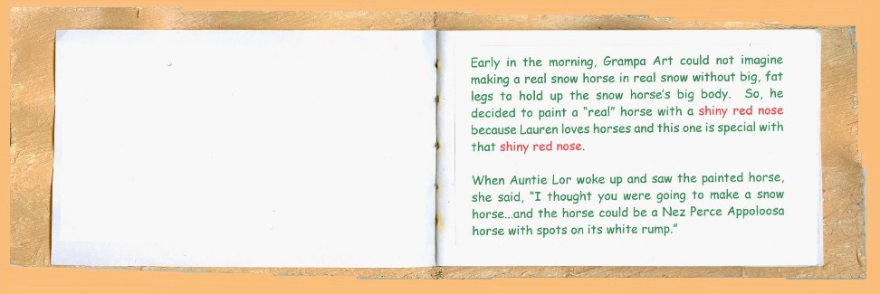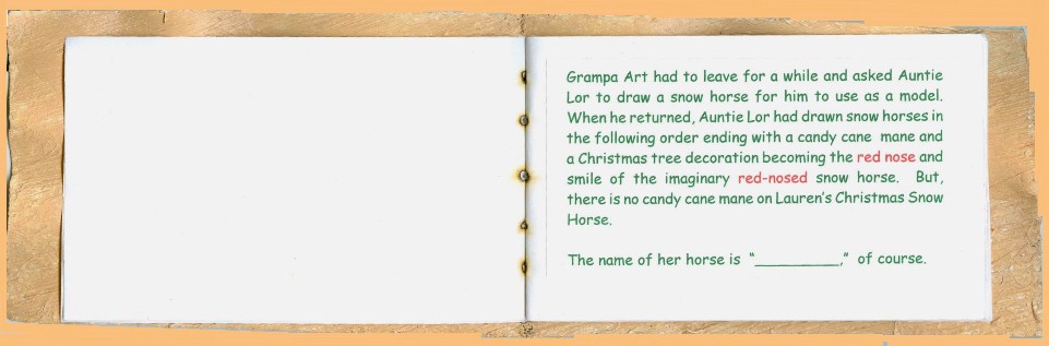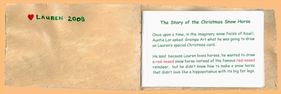 Before I talk about Kevin and Lorilyn's visit to Kaua'i, I'm going to put a copy of the Christmas Snow Horse I painted on cocofiber for a cover of the story booklet I made for my seven-year old granddaughter, Lauren.