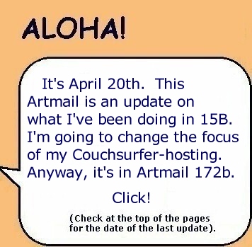 It's a time-consuming task to figure out how the above could work out then get it woven into the "tapestry" of my life's senior years and a little history, too, written on to one Artmail page. My thinking is that at my age (76 in July), I don't need to be making a lot of new "CS friends" from all over the world. It makes more sense to me to re-visit with old friends and the former students from "our past lives." We put in a lot of hours in each others' presence...we all learned and memories made (and forgotten?) during those student/teacher days. So, those are the people I would like visiting me and "surfing my couch." Hopefully they would have no more expectations than any other CouchSurfers.
