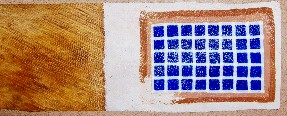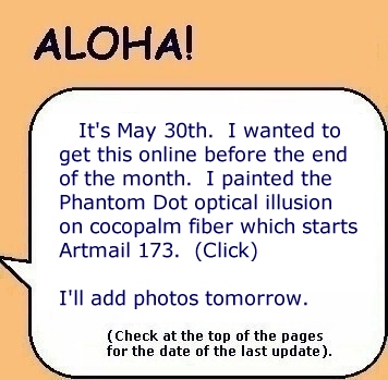 I have been doing a lot of things that have been keeping me away from getting an Artmail online in May. I have some photos taken at different times of the month around 15B that I will put into this Artmail. It has become more complicated...I download from the card to my desktop which has Vista. Then, when I make time, I reduce all the images to 1500 pixels. My web designer program doesn't work with Vista so I must email those images to myself and download them into my notebook. There's a problem there...the notebook's left cursor doesen't work any more. Rex M., a former student, sent me a Targus wireless mouse to use...Mahalo...It's tricky typing, then reaching for the wireless mouse instead of the cusor button. That's a time-taking process that I didn't have to do before. Now, (on June 4th) I'm going to put some of the photos and upload them to this page as I finish for that session. In the meantime you can try to count the Phantom Dots in the cocofiber painting below: