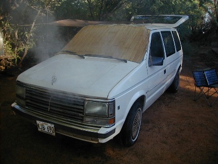 When I work on my laptop early in the morning, if use up my batteries, I plug into the cigarette lighter and continue working. Because I do that often and don't drive around much, I thought I had better run the car a while and let the battery charge. Clifford arrived then doing his chores, so I went up to the pavilion to talk story and played the ukulele. I forgot about the van running until I saw the steam coming out. Antifreeze was boiling out and on to the ground.