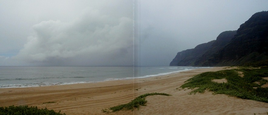 It's been a very different year at Polihale...a lot of rain which makes it very green. Quite a few people who have visited Polihale and have my URL go to Artmails and see how Polihale changes throughout the year. I have taken a bunch of photos and have quick-stitched some together. Also, there has been some newsworthy activity near Polihale. This created a Ranger Danger situation. Yes, I got hassled...I have moved to another place much more isolated, but still close enough to all the necessary facilities. It's already the 21st. I haven't really had a lot of computer time...clouds blocking the sun and rain closing the solar panels.