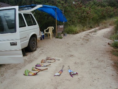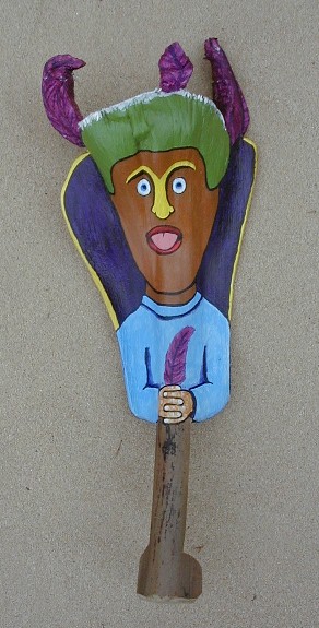 One of the projects that I wanted to get started on again is painting the Purple Feather People. They are a unique group of Polihale Palm Frond Faces. Most of the completed ones are in my storage locker. The ones that I have been carrying with me are these: