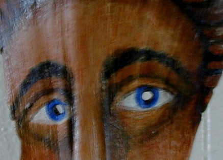 This is a mask with eye-holes. I was taking it to a show with some others and a piece of paint chipped off. I put the band-aid on it then. It will be repaired.