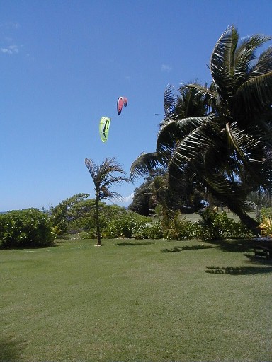 I did end up going to Polihale a week ago and I put the photos online last week. Between then and the 21st, the only photos I took were of progress painting palm fronds. Just about every day, I go to the post office for my mail then go to Tashi's for a swim and to talk story. Pat was there on the 21st and a lot of wind sailers were where we usually swim. I took one photo from Tashi's of two sails.