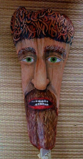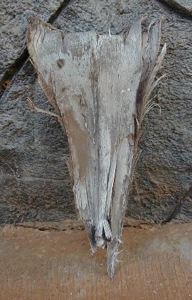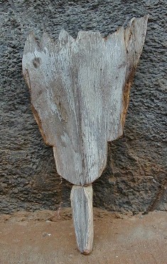When I decided to do the Purple Feather People project, these palm frond bases would be numbers 1 through 12. The original No. 1 is becoming The Impostor, now Kanaloa is No. 1. Anyway, after I had been painting on most of these 12, I went to the Double Burner Pavilion to find some more palm fronds. There were none left. The ones that I expected to get were burned and ruined. I searched around to see if I could find any palm frond bases that might work. The one below is the only one I found. It was even rejected for burning. Is there a face in there? I decided that this one will become Number 13: