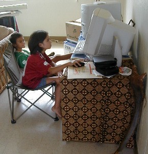 I have a lot of different things to work on for this Artmail, but some of that will have to be put up tomorrow or the next day. When I was working on Artmail 80, there was a knock on the door. It was RJ. He was coming for the present that I wasn't here to give him because I went to Polihale on the 23rd. I took a few photos. He wanted to play one of the educational games on the computer. Then his sister, Lani, rode by on her bike and saw his bike on my walk. She's a computer whiz and told him what to do then sat back and watched. Then she played. We got other CDs with more games. Then it was time to go and I came back in here and uploaded Artmail 80. Here are the photos: