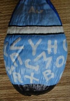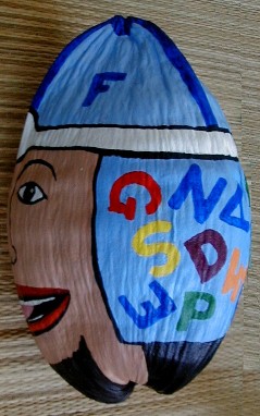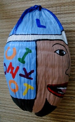 I have another coconut that I am working on now for Lauren. If I do it the way I originally wanted, there is no way she could receive it before Christmas. I was going to paint a coconut head which I was going to name Alf A. Bett and he was going to have all the letters of the alphabet on his hat and flap. The L, A, U, R, E, and N, were going to be one color, the other letters not that color. I was also thinking of painting all the digets, too, No. 1 in Lauren's color.