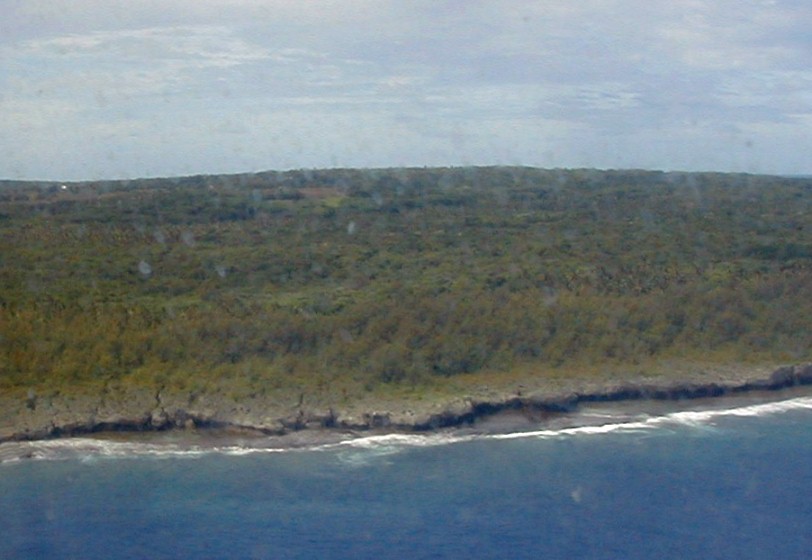 Here you can see the edge of the makatea which is 30 to 50 feet high. It can be very sharp with caves and chasms. Notice the thick vegetation.